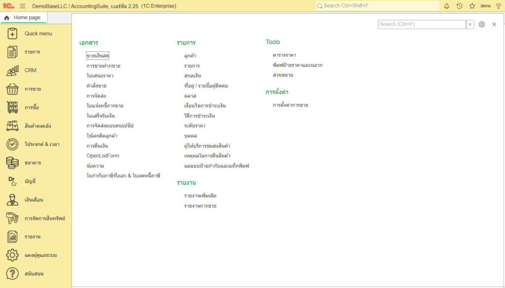 Here you can try online demo of AccountingSuite application developed on 1C:Enterprise platform.