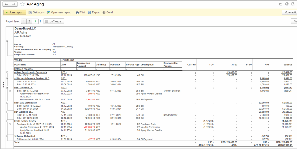 - At the top, grouping options such as Vendor, Credit Limit and Document, Date, Responsible Person are available. This means the report will first show totals by Vendor (including credit limit information) and then break them down by individual documents and dates for more detail.