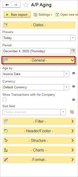 he General section of the AP Aging report controls how amounts are aged, which currency is used, whether to show transactions without a company, and how to sort the output.