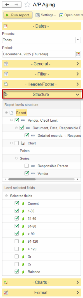 In Level selected fields, choose which numeric columns (aging buckets and balances) appear for the selected level.