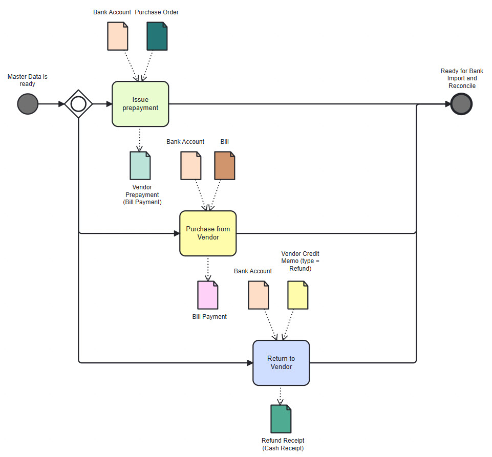 - Vendor Prepayment (Bill payment) – it is based on Purchase Order document (Dr Vendor Prepayments Cr Bank Accounts or Post Dated Checks)