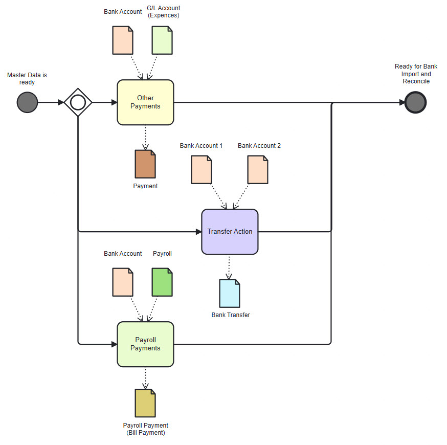 - Payroll Prepayment (Bill payment) – it is based on Payroll document (Dr Payroll Liabilities Cr Bank Accounts)