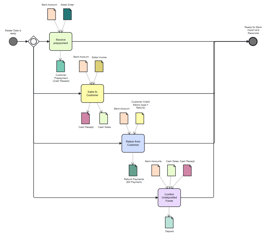 - Customer Prepayment (Cash Receipt) – it is based on Sales Order document (Dr Bank Accounts Cr Customer Prepayments)