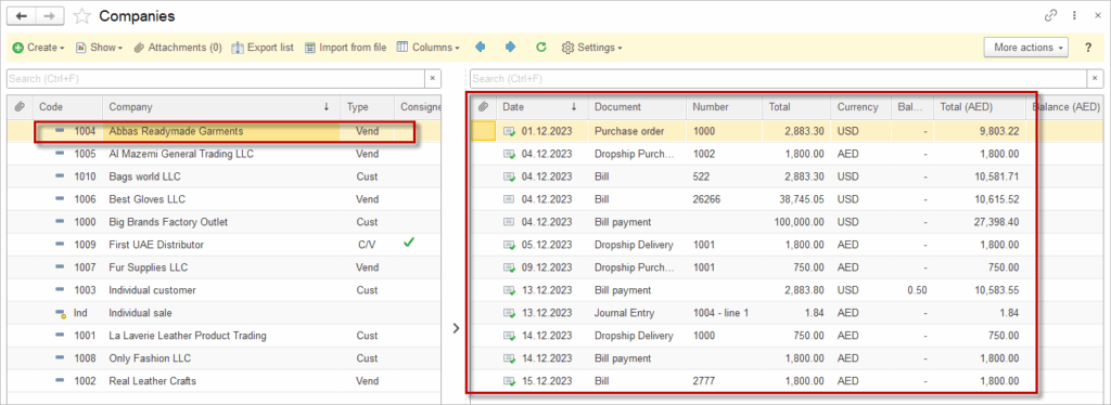 - Instantly tell whether a company is a customer, a vendor or both by the indicator column next to the name.