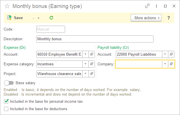 - Choose if an earning is a Base salary and should be calculated on number of days actually worked or if it is a fixed amount independent on days actually worked.