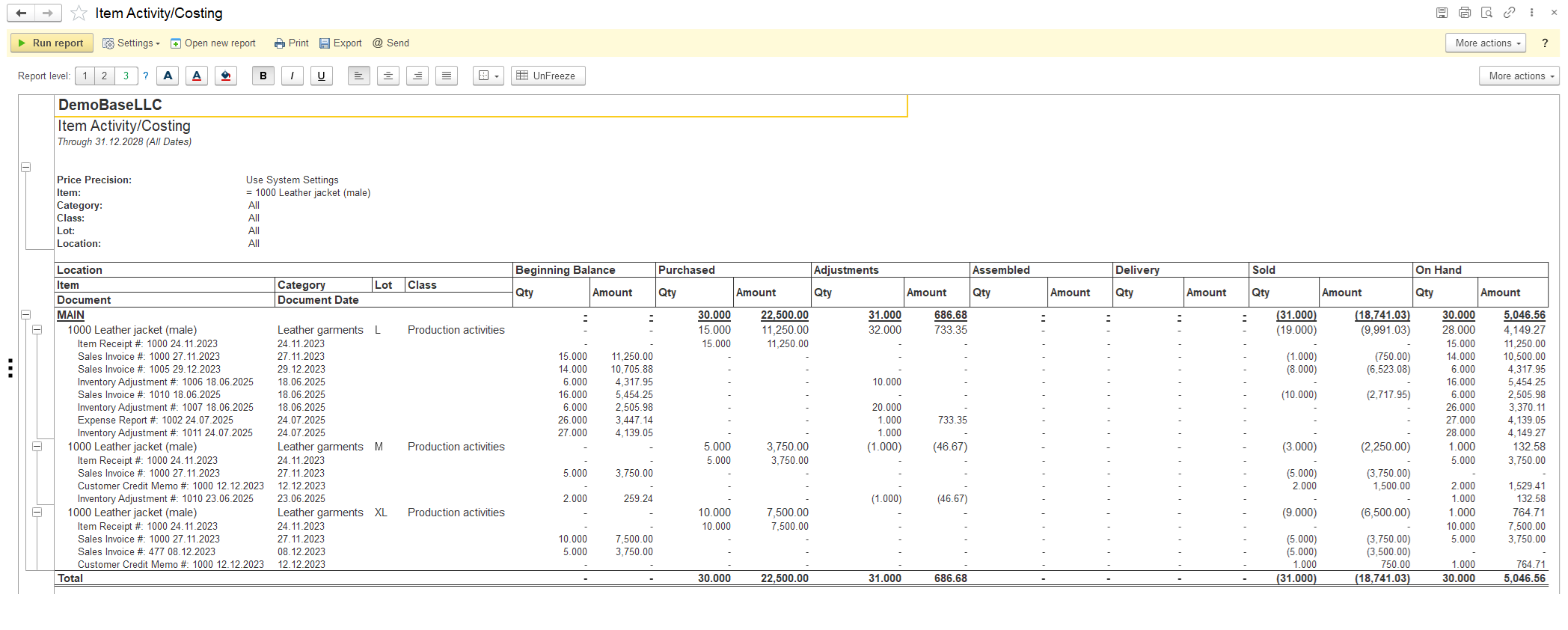 This report provides a complete, summarized history of all inventory movements and their financial impact for a specific item and document (with Recorder field mode) over a defined Period.