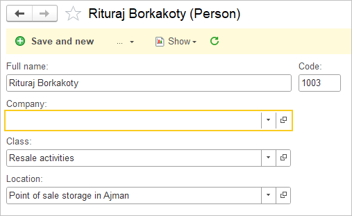 The Persons list includes these attributes: Full name, Company, Class, and Location. Class and Location will be automatically assigned to documents created by the User that is linked to Person. Both Class and Location can be changed manually in the documents.