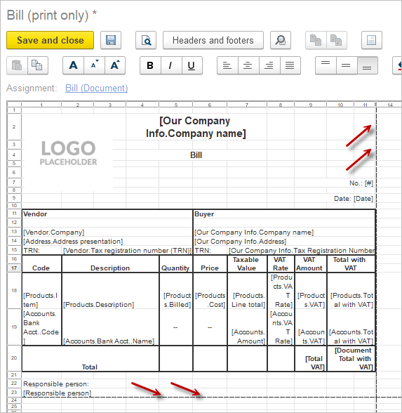 In Print form templates (Admin Panel – Print forms, reports and data processors) menu you can view the full list of templates used in our application. With a double click on a template, you can go to the template editor and change form for your needs and convenience.
