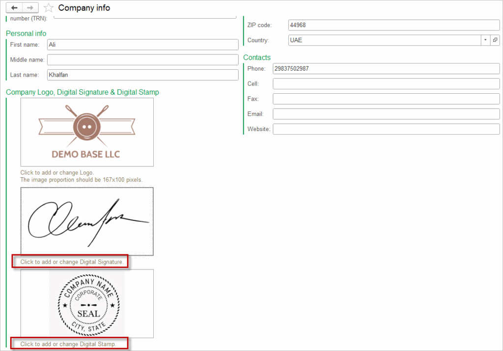 Navigate to Admin Panel – Company Info and upload the image of Digital Stamp (Seal) and/or Digital Signature images: