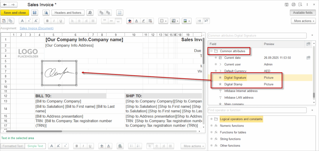 - Save the form. After this, all next versions of this document will be printed with this field