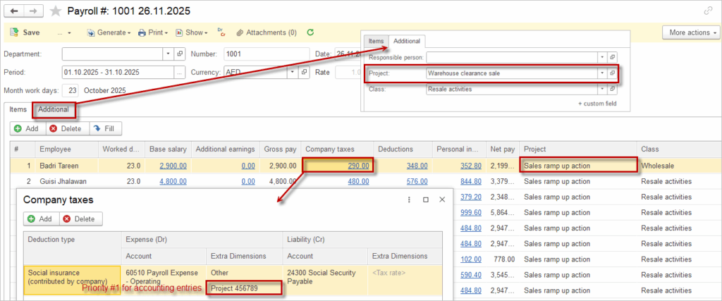 In the screenshot below, the Project attribute is set as Warehouse clearance sale. However, the user manually changed the Project for line item to Sales ramp up action. The Project specified at the line item level takes precedence and will be used in the accounting entries (even if it is empty). For a particular line item, user has changed Project in the Company taxes tab to Project 456789. For the entry in 60510 Payroll expense account the Project 456789 will be used. For all other accounting entries resulting from the first line item, the Sales ramp up action project will be used.