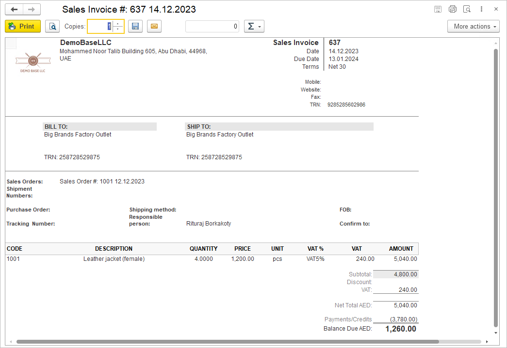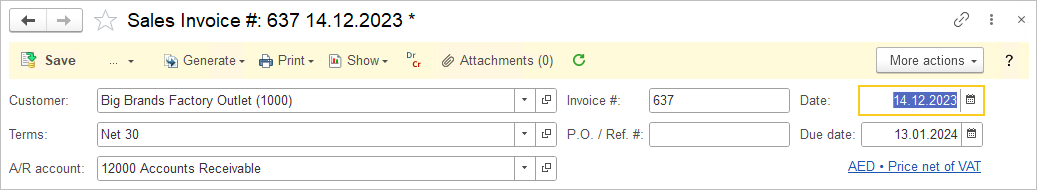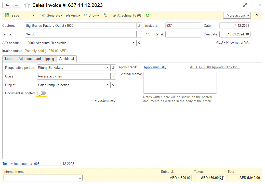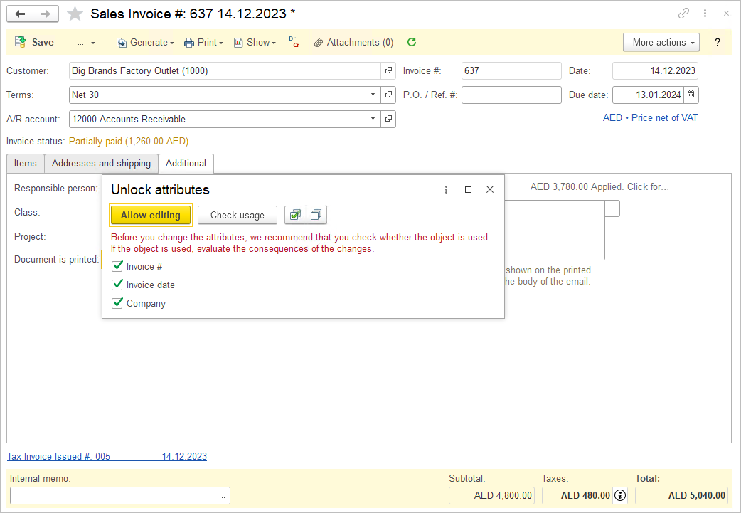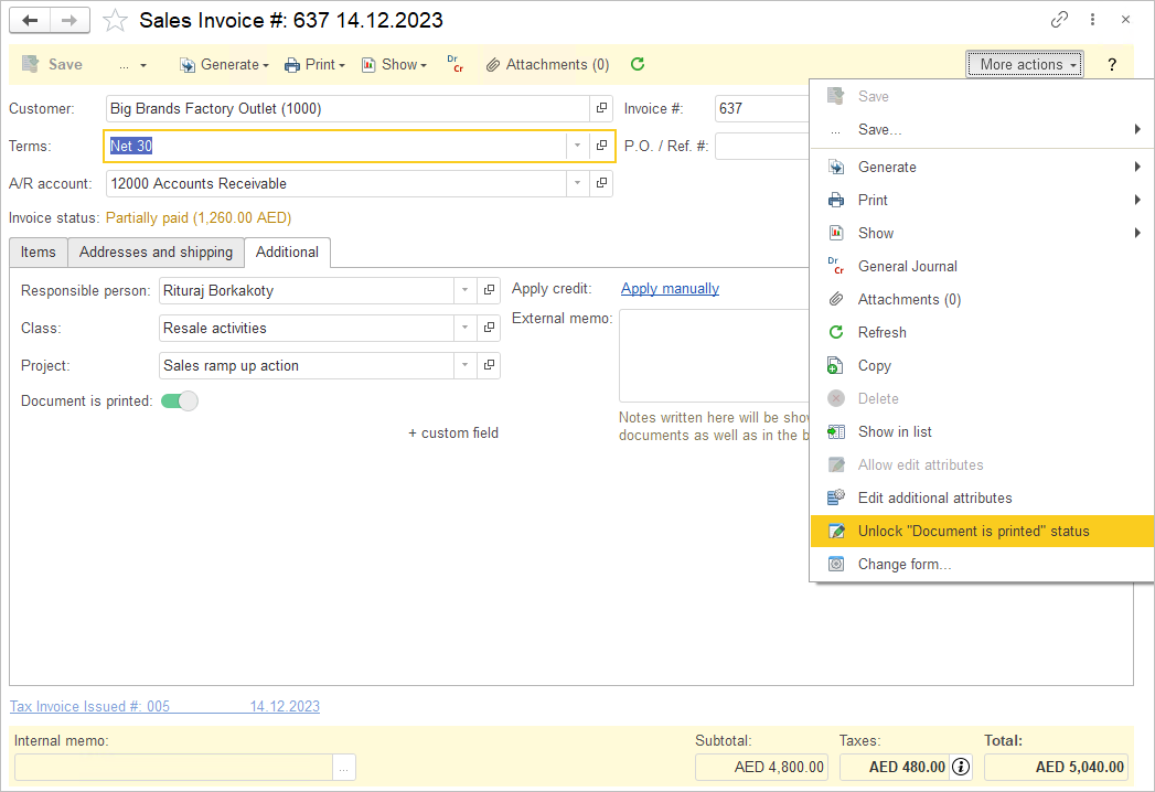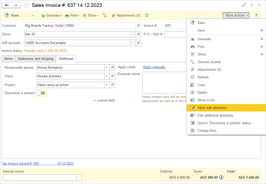 After switching the mark Document is printed to Off the fields become editable except protected key fields (Company, Invoice # and Date). To edit such fields Admin user needs to use More actions – Allow edit attributes menu.