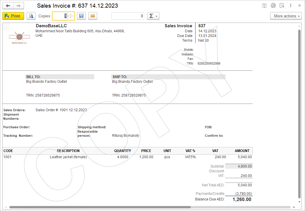 Each type of print form has its own printing counter and a COPY will appear only for the second time on document’s print forms that have not been printed before, although there will already be a COPY watermark somewhere.