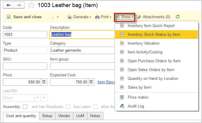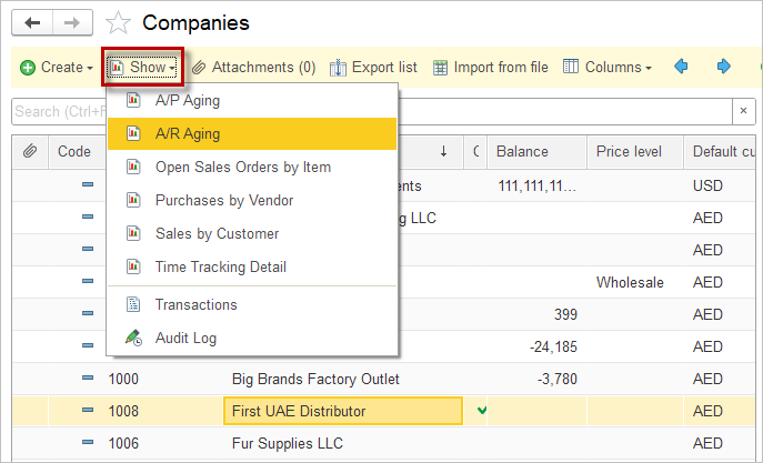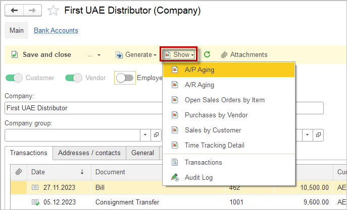 - from the Companies list and from the Company card (available reports may vary based on Customer / Vendor status in the Company);