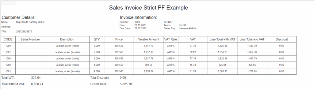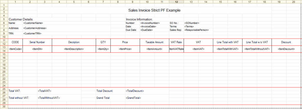 This example presents a print form for a Sales Invoice document. This print form has a strict structure, limited to five lines per document. This constraint ensures the footer always remains in a fixed position, making it possible to precisely align the form with a specific pre-printed template or layout.