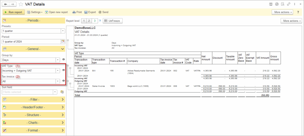 1.The VAT Type (1) selection field allows to select either Incoming VAT or Outgoing VAT or both.