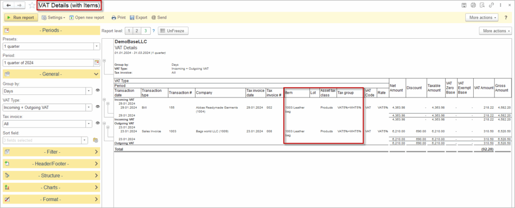 “VAT Details (with Items)” report provides low-level information by displaying columns “Item”, “Lot”, “Asset tax class” and the Item “Tax group”, whereas the “VAT Details” report supresses this information.